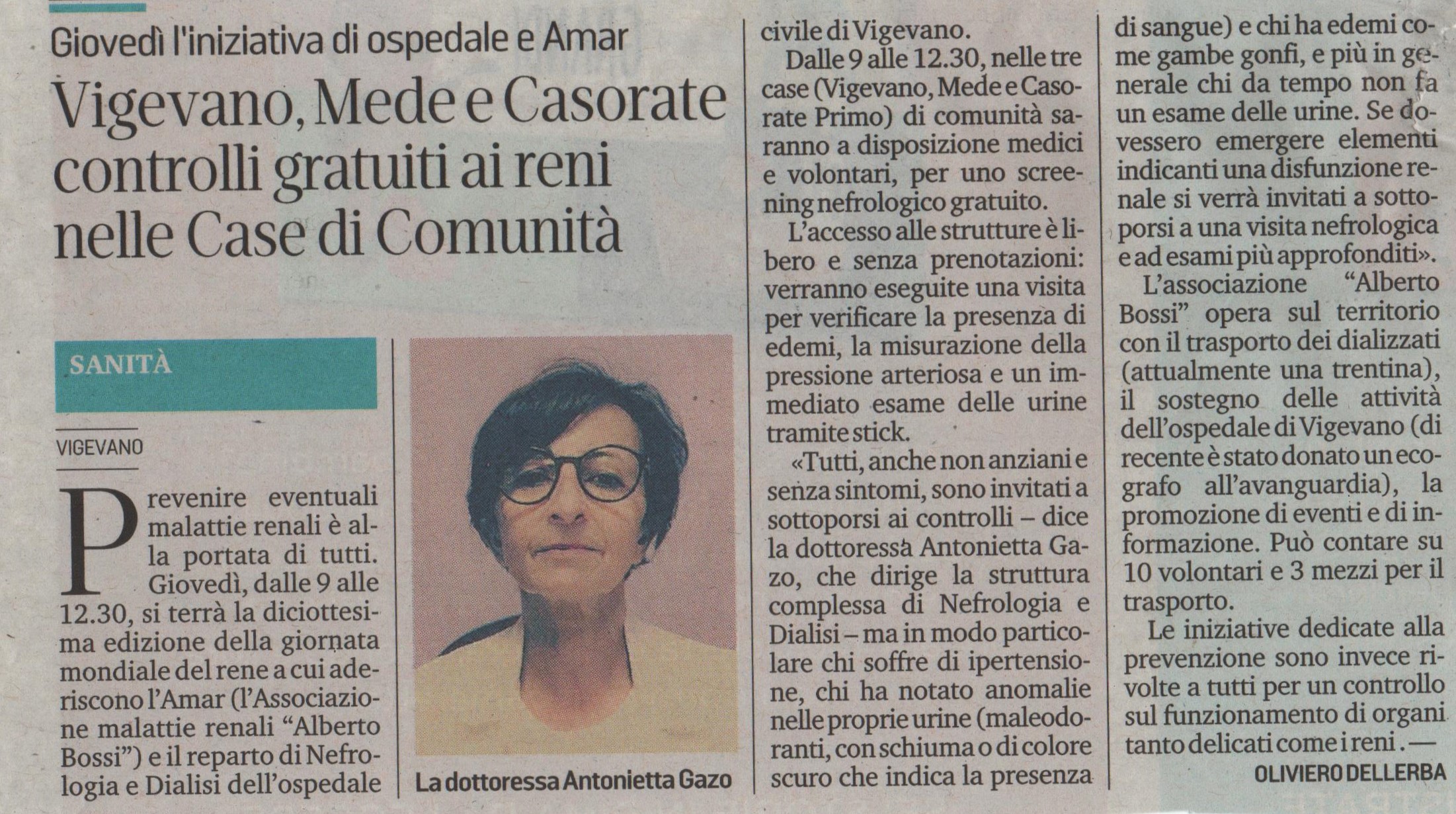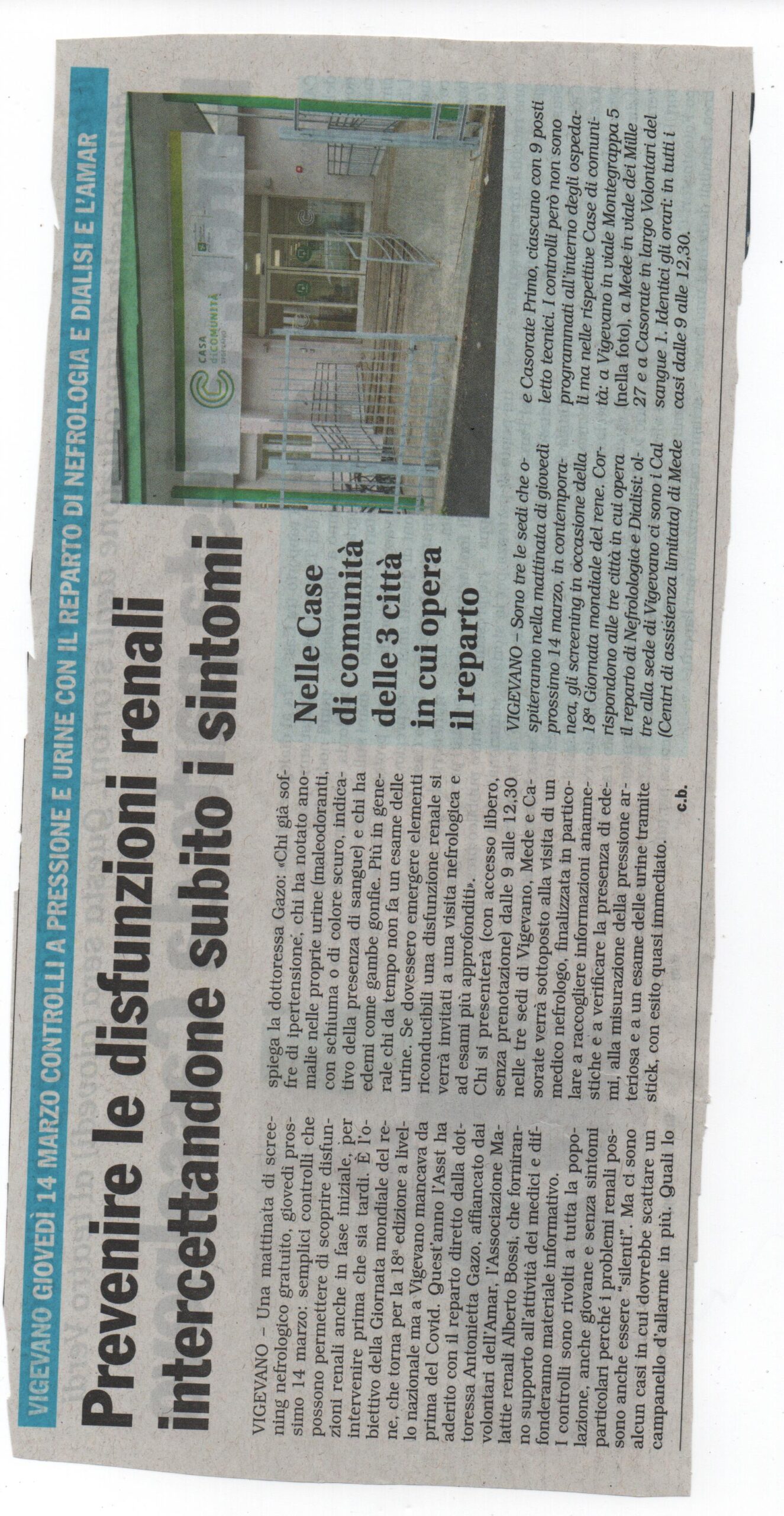 I Medici del Reparto di Nefrologia e Dialisi di Vigevano, in collaborazione con A.MA.R. Vi attendono per lo screening nefrologico (visita – misurazione pressione arteriosa – esame urine) presso: